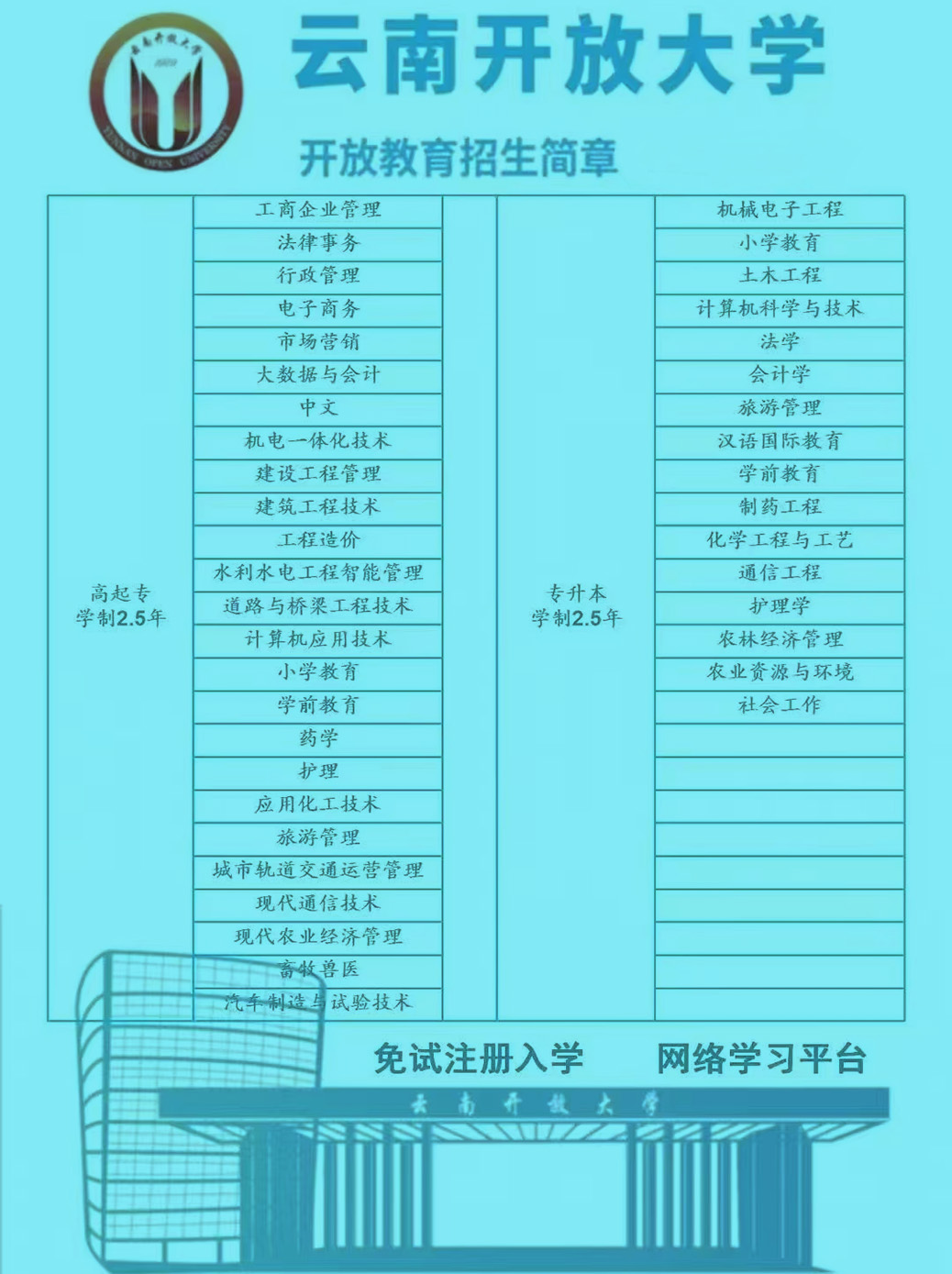 云南开放大学开放教育网学的特色优势: (1)国民教育文凭。毕业证由学校颁发,教育部电子注册,学信网(https://www.chsi.com.cn)可查; (2)免试入学。无须参加入学考试,新生报名资格审核通过,即可正式入学。2026年春季批次学员,学籍注册2026年3月1日; (3)学制2.5年。学生在2.5年内修够学分,即可毕业。学籍八年内有效(解释:如因特殊情况未能2.5年毕业的学生,8年内可办理毕业手续。若满8年仍未毕业,则学籍自动注销); (4)官网缴费。取得入学资格后,学员本人通过学校官方缴费平台缴纳学费。每学期缴纳一次,并非一次缴清全部学费。报名时不需要交费,审核通过后才缴纳注册建档费300元。所有费用一律由学生本人通过学校官网缴纳,除学校规定费用外,没有其他任何费用; (5)免试入学,学习便利。学员通过入学审核即可录取入学,并注册学籍。平时网上学习,期末考试网上完成。有效解决工学矛盾。 一、学校简介 云南开放大学是一所由云南省人民政府主办、云南省教育厅主管,以信息技术为支撑,坚持学历教育与非学历教育并举,以开放教育办学模式,面向全体社会成员开展终身教育的省属公办新型本科高等学校。其前身是1979 年5月建校的云南广播电视大学。2010 年10月,国务院批准云南作为国家深化教育体制综合改革、探索开放大学建设模式的5 个试点省(市)之一。2012年12月26日,教育部批准云南广播电视大学更名为云南开放大学。 二、招生专业设置 高起专层次:行政管理、学前教育、小学教育、工商企业管理、电子商务、市场营销、大数据与会计、中文、机电一体化技术、药品生物技术、建设工程管理、应用化工技术、法律事务、城市轨道交通运营管理、道路与桥梁工程技术、工程造价、建筑工程技术、水利水电工程智能管理、计算机应用技术、数字媒体艺术设计、电信服务与管理、现代通信技术、汽车制造与试验技术、数控技术、应用电子技术、护理、汽车技术服务与营销、现代家政服务与管理、现代物流管理、药学、酒店管理与数字化运营、旅游管理、餐饮智能管理、茶叶生产与加工技术、现代农业经济管理、社区管理与服务、园艺技术、作物生产与经营管理、畜牧兽医、社会工作、农村新型经济组织管理、畜禽智能化养殖、花卉生产与花艺、农产品流通与管理、食用菌生产与加工技术、中草药栽培与加工技术。 专升本层次:法学、小学教育、土木工程、计算机科学与技术、会计学、制药工程、机械电子工程、学前教育、护理学、化学工程与工艺、通信工程、旅游管理、汉语国际教育、农林经济管理、农业资源与环境、社会工作、智慧农业。