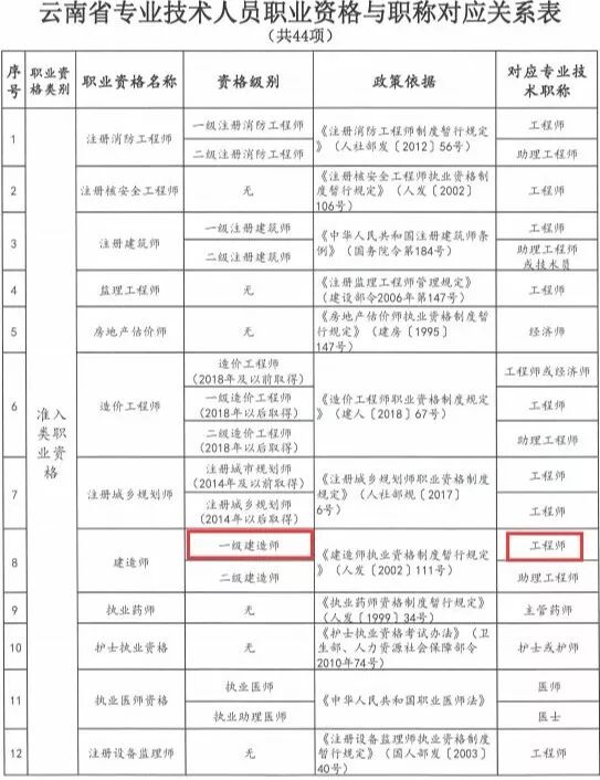 云南省人社厅关于确定专业技术人员职业资格与职称对应关系的政策解读 各州、市人力资源和社会保障局,省级国家机关各委办厅局,各有关企事业单位: 为贯彻落实《中共云南省委办公厅 云南省人民政府办公厅印发<关于深化职称制度改革的实施意见>的通知》(云办发〔2017〕29号)精神,健全完善职称制度体系,建立职业资格制度与职称制度衔接机制,避免专业技术职业资格考试与职称评审交叉设置,减少重复评价、降低社会用人成本,鼓励创业创新。经研究,在我省部分职业领域确定职称与专业技术职业资格对应关系(见附件)。现将有关事项通知如下: 一、在对应关系范围内,我省所属企事业单位专业技术人员按规定取得的相应专业技术职业资格证书,可认定其具备相应系列和层级的职称,并可作为申报高一级职称的条件。对符合对应条件的人员,用人单位可根据工作需要,按照相应专业技术岗位任职条件和聘任程序,择优聘任相应级别专业技术职务。 二、专业技术职业资格和职称对应关系根据国家职业资格改革情况适时进行调整,实行动态管理,如本通知与国家出台的有关职称与职业资格对应关系新规定不符的,按国家新规定执行。 三、专业技术人员取得职业资格并聘任相应专业技术职务后,符合相应条件的,在申报高一级职称资格时,可直接按对应专业职称资格进行申报;职业资格证书与职称证书具有同等效力,不单独换发或补发职称证书。 本通知自颁布之日起实施,由云南省人力资源社会保障厅负责解释。 附件:云南省专业技术人员职业资格与职称对应关系表 (共44项) 云南省人力资源和社会保障厅 2019年9月26日